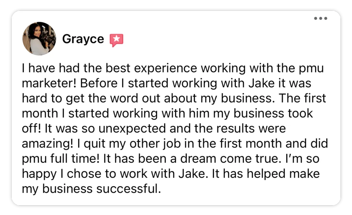 "I've been working with Jake and his team for over a year now! His services have helped MY BUSINESS REACH $10K A MONTH! I've had an amazing experience and IT'S DEFINITELY BEEN WORTH THE INVESTMENT"